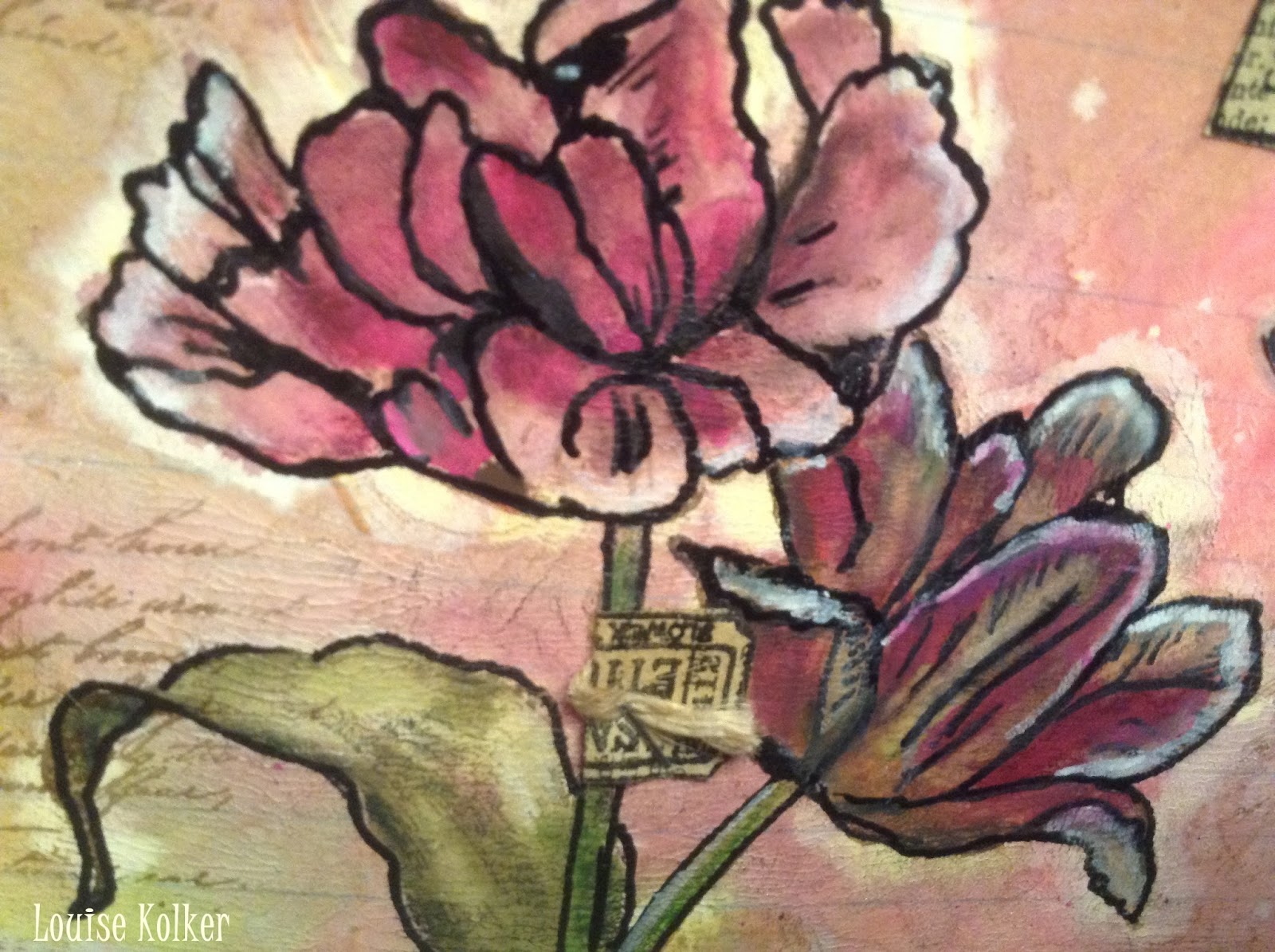 In both cards I used the Art Journey stampsets Tulips and Text. After stamping the flowers I took some bleach to lighten the tulips. In today's card the bleach flowed across the lines, but I rather like that look. I then colored the flowers with inktense pencils and a white charcoal pencil. The lines were retouched with a Graphik Line Painter from Derwent.
