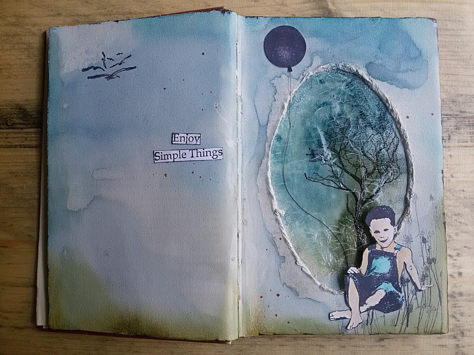 Beplak hier en daar met tekstpapier en breng acrylverf aan met je vingers.